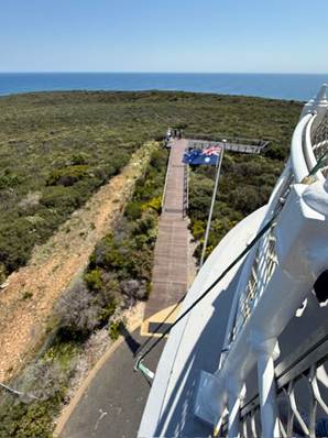 The twenty-metre-tall Cape Naturaliste lighthouse was activated in 1904, became fully automated in 1978 but remained fully staffed until 1996. Before automation, the rotation of the light was achieved by a gearing system whose weight was wound up (just like the pendulum of a grandfather clock) every 45 minutes. Staff watches were 4 hours on, eight off, every day of the year.