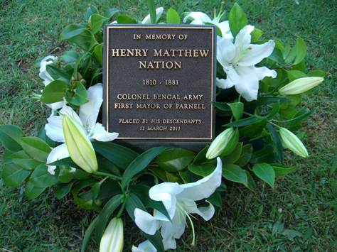 Back in March 2011 I had organised, with others, the first Nation get together, deliberately coinciding with the 130th anniversary of the death of my great great grandfather Henry Matthew Nation (HMN). In the same hotel in Parnell was one Dinah Warren (HMN was her great grandfather) and she persuaded me to help her get some flowers to put around the plaque we had placed on his grave.