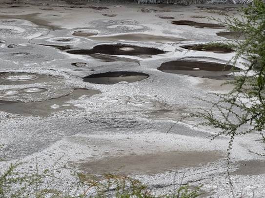 …… form the backdrop to the Pōhutu geyser, which erupts once or twice an hour. It’s easy to become completely mesmerised by the constantly evolving geothermal landscape but eventually we had to move on.