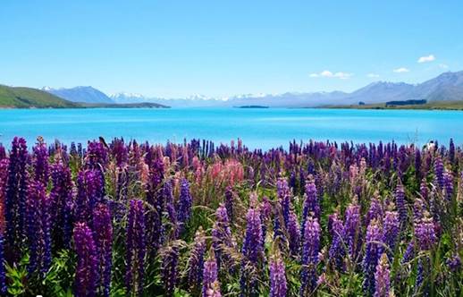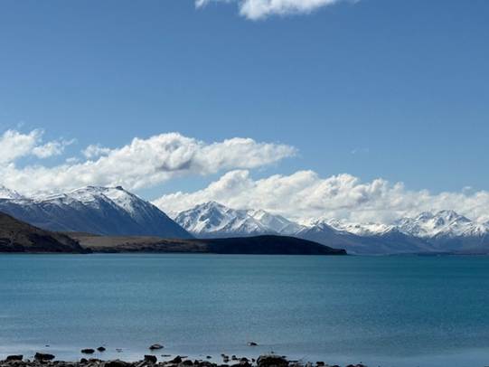 Lake Tekapo is known for the remarkable blue colour of its water, caused by rock flour, finely ground particles of rock brought down by the glaciers at the head of the lake and held in suspension in the melt water.