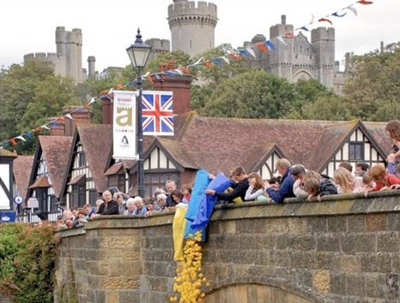 “Ah!” Says Mo, “There’s one held every year on the River Arun during the Arundel Festival of The Arts, here in Sussex. Two thousand yellow ducks, each with a number corresponding to a £1 ticket, are poured from a bag from a bridge.