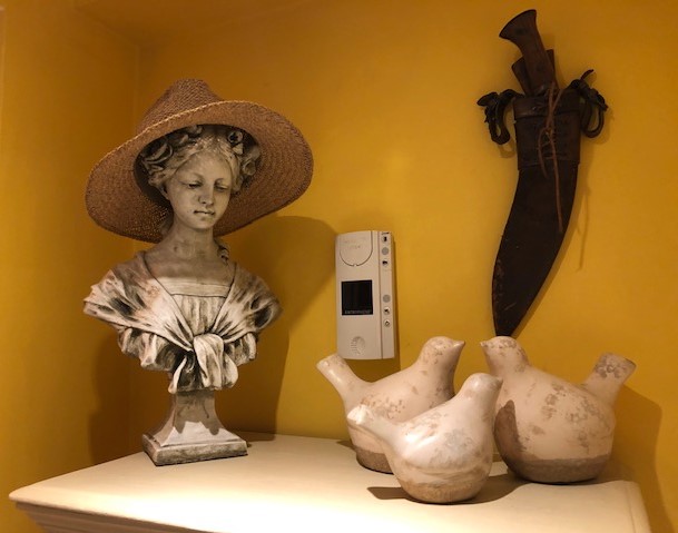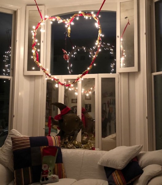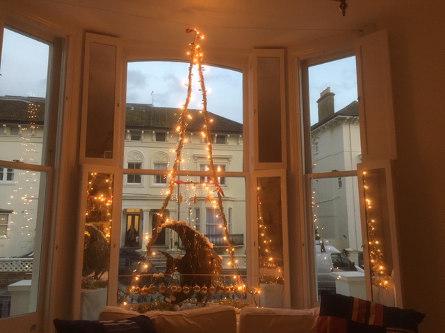 One set OK! Second set? Nothing! This particular set comprised 40 white lights, simple, effective and classy. The manufacturers had thoughtfully provided a few spare bulbs and a little green plastic tool to extract the individual defunct bulbs, But which one out of the 40? In the old days the bulbs would have had a screw fitting and were often loose, so the IA (Immediate Action – an old military expression particularly relating to small arms handling) was to check the tightness of the individual bulbs. These little plastic-housed bulbs were just pushed in, the bulbs themselves too thick to see whether the wire had broken. Pulling one out showed a little copper wire on each side, making contact with connectors deep inside. I pulled them all out, discarding ones which looked dodgy ……. finding new ones …… and replaced them all in their little housing. Expectantly I plugged them back in and switched the circuit on. Nothing! OK! Replaced the plug’s fuse. Nothing! …… Amazon delivered another set during our ‘Prime’ trial and the result – fashioned into a heart shape with Uncle Tommy flying around in the middle – does the business I think.