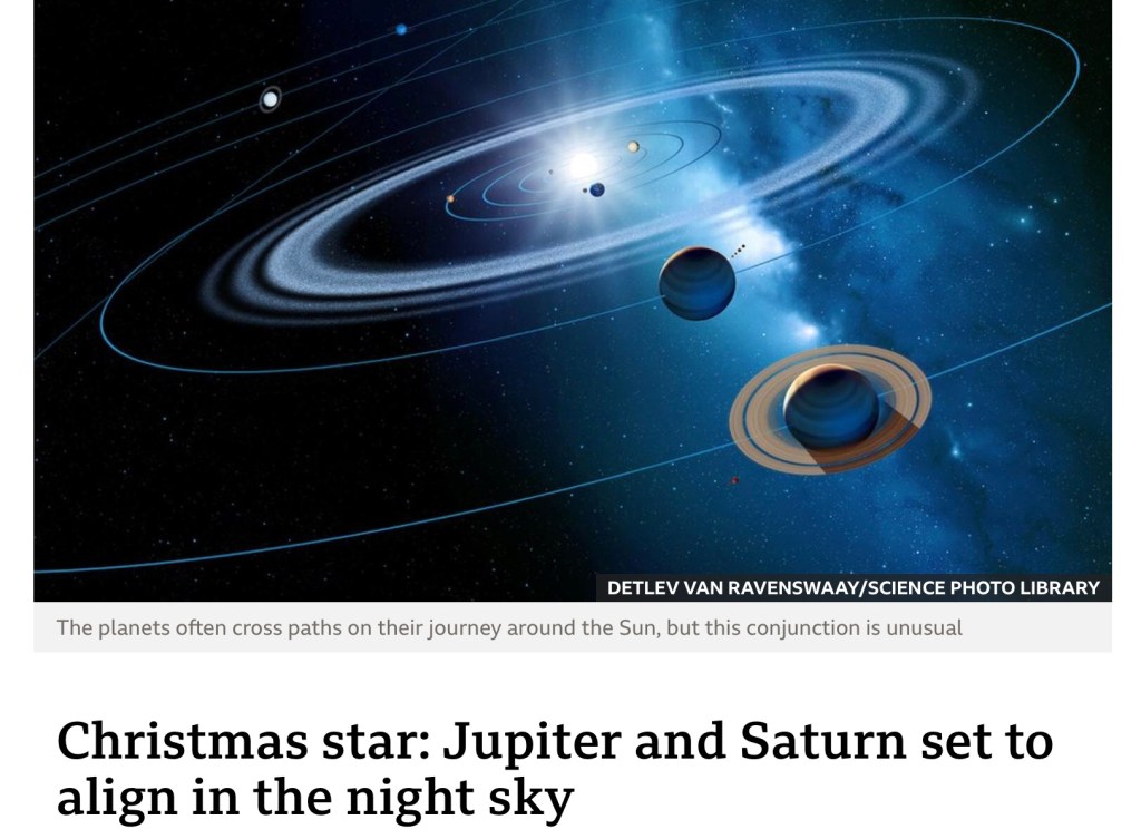 So with all the sad and negative aspects of the last few days of 2020 maybe making us feel gloomy and doomy, we should all ponder on the recent alignment of the planets Jupiter and Saturn. It’s not impossible that the Star of Bethlehem was another instance of this bright sight in the night sky.