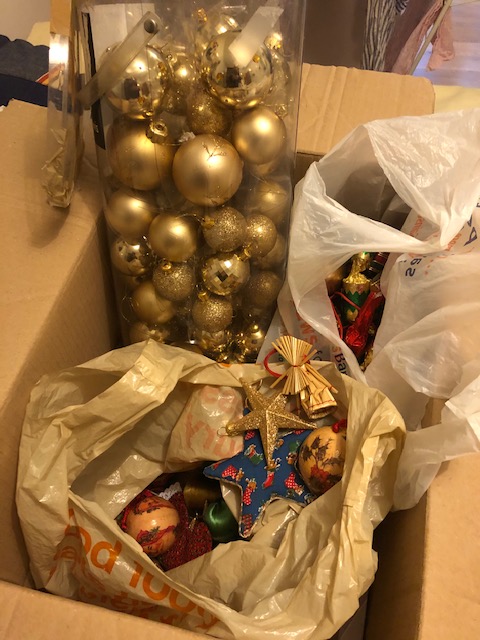 Rummaging around in the dusty cardboard box here, I detected the wires of the Christmas lights in one old supermarket plastic bag and gently pulled it out. Time for the baubles, bangles and beads ….. and tinsel later. But first I had to check that the lights are working.