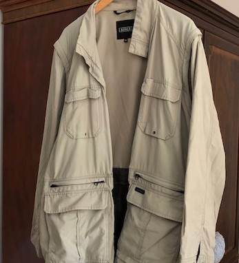 Needing an outside jacket with lots of pockets when out with my Labrador Tom, I dropped into Farlows on Pall Mall opposite the IOD in 2004. I am not a huntin’, shootin’, fishin’ chap but my Aigle angler’s jacket is perfect; pockets galore, even one at the back – possibly to bring back the stolen (poached?) trout – but used by me as somewhere to put the detachable sleeves.
