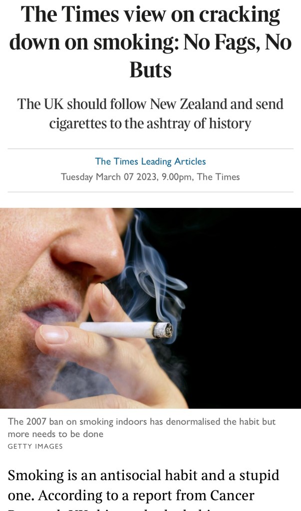 Mo has been reading some of my past posts and mentioned ‘No Buts no Butts’ (PC 234 June 2021) as she’d recently seen that New Zealand is implementing a law which means if you were born after January 1st 2009 you will be unable to buy cigarettes legally.