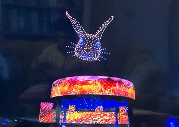 And never one to miss an opportunity to have fun, our rabbit Francisquinha (see PCs 172, 217 & 331) managed to appear above the castle holding on to dozens of drones!