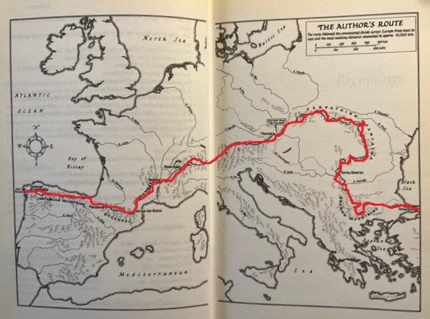 If you’re into walking, it’s possible you’ve thought of walking one of the Caminos, the famous pilgrim routes that converge on Santiago de Compostela in northwestern Spain. Regular readers will remember my mentioning the amazing walk undertaken by Nicholas Crane in 1992 from Cape Finisterre in the west of Spain to Istanbul, the capital of Turkey, recounted in ‘Clear Waters Rising’. Nicholas’ route was along the ridge of Europe; rivers to his left ran to the Bay of Biscay, the English Channel and the North Sea, those to his right south into the Mediterranean. His wife Annabel accompanied him on the first five-day 100kms, along the pilgrim way to Santiago de Compostela. (Note 1)