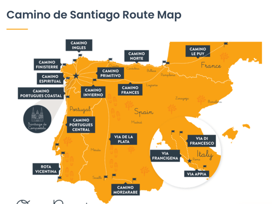 The most well-known camino is the French Way, Camino Francés, which starts in Saint-Jean-Pied-de-Port in the French Pyrénées and runs through Pamplona, Logrono, Burgos and Leon before reaching Santiago de Compostella; some 800 kms. The Portugues Way should start in Lisbon, run through Coimbra and Porto, then through Vigo to Santiago. The Camino Ingles, for those pilgrims coming from Ireland and England by boat, starts in Ferrol or A Corunna.