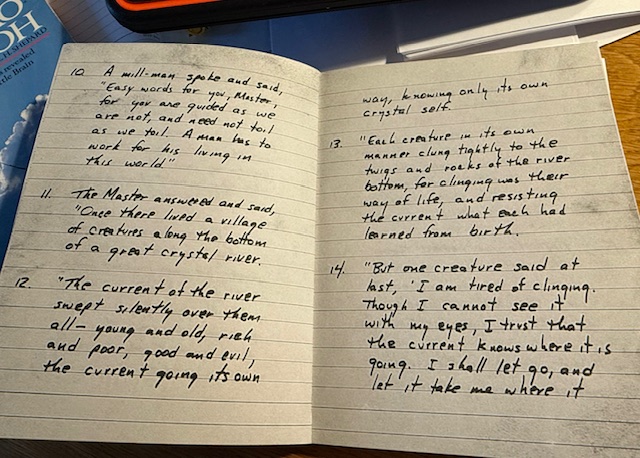 “Once there lived a colony of creatures (Note 1) along the bottom of a great crystal river. The current swept silently over them all, young and old, rich and poor, good and evil, the current knowing its own way. Each creature in their own way clung tightly to the rocks at the bottom of the river, for clinging was their way of life, what they had learned from birth. But one day a young creature said he was tired of clinging, was bored, that he would let go, trust the current and let it take him where it would. The other creatures said he would surely die, smashed against the rocks but, unpersuaded, he let go and the current lifted him up and took him downstream, free. Creatures downstream saw him and cried: ‘See, a miracle! He’s the messiah come to save us.’ ‘I am no more the messiah than you. The river delights to lift us free, if only we dare to let go ……’.
